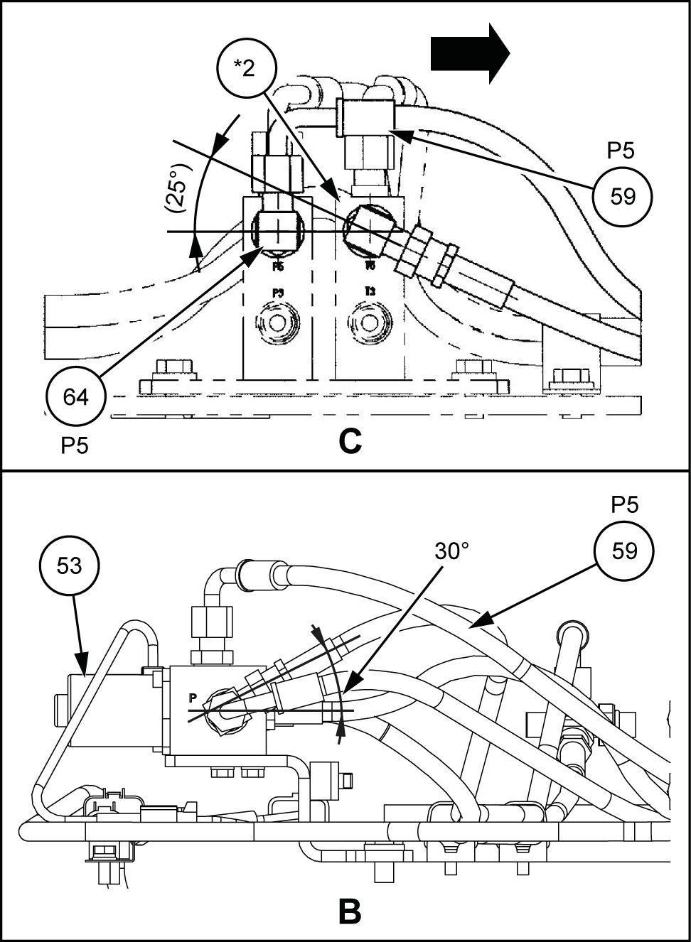 Bringen Sie das Kniestück (60) Anschluss pb2 des Steuerventils (*3) V erbinden Sie Anschluss von til (43) und Anschluss pb2 von Steuerventil (*3) mit dem Baugruppenschlauch (50)