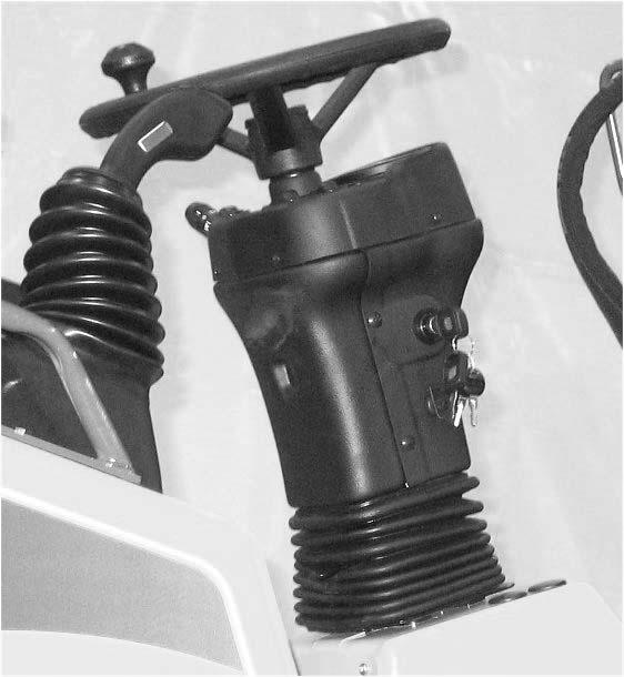The hand throttle, located to the right of the operator’s seat, controls engine speed independently from the accelerator pedal. The hand throttle does not control travel speed.