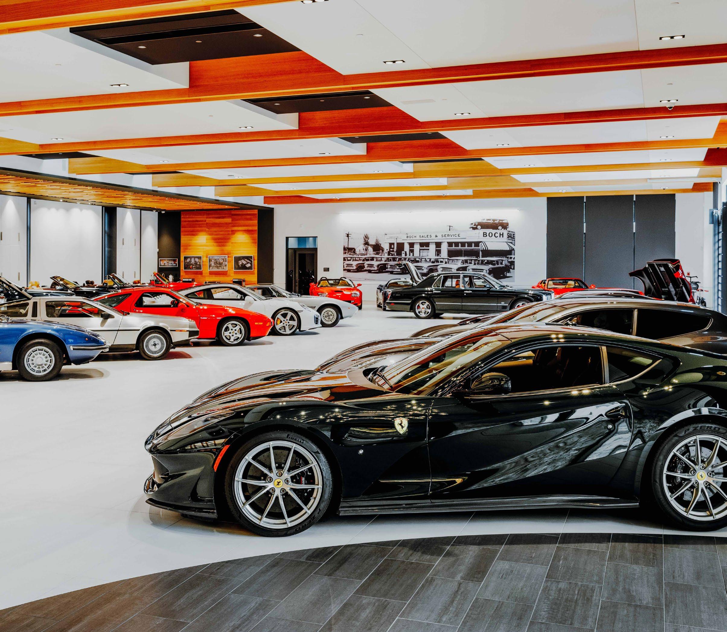 Designed and built to house an extensive exotic car collection, Boch Auto Salon can be thought of as two structures. The A-frame area has a full basement, concrete floor slab on deck, Douglas fir glulam trusses and structurally insulated roof panels. The finished space includes: a car detail bay, open gallery, modern kitchen and bar, and private suite. The main gallery is slab on grade with a steel joist and a metal deck insulated roof. The glulam structure and the corresponding decorative wood beams in the main gallery were all hand-stained to coordinate with the white oak wall treatment. Additionally, the interior stair is a custom design made from painted architectural-quality steel that floats away from the interior stone wall.