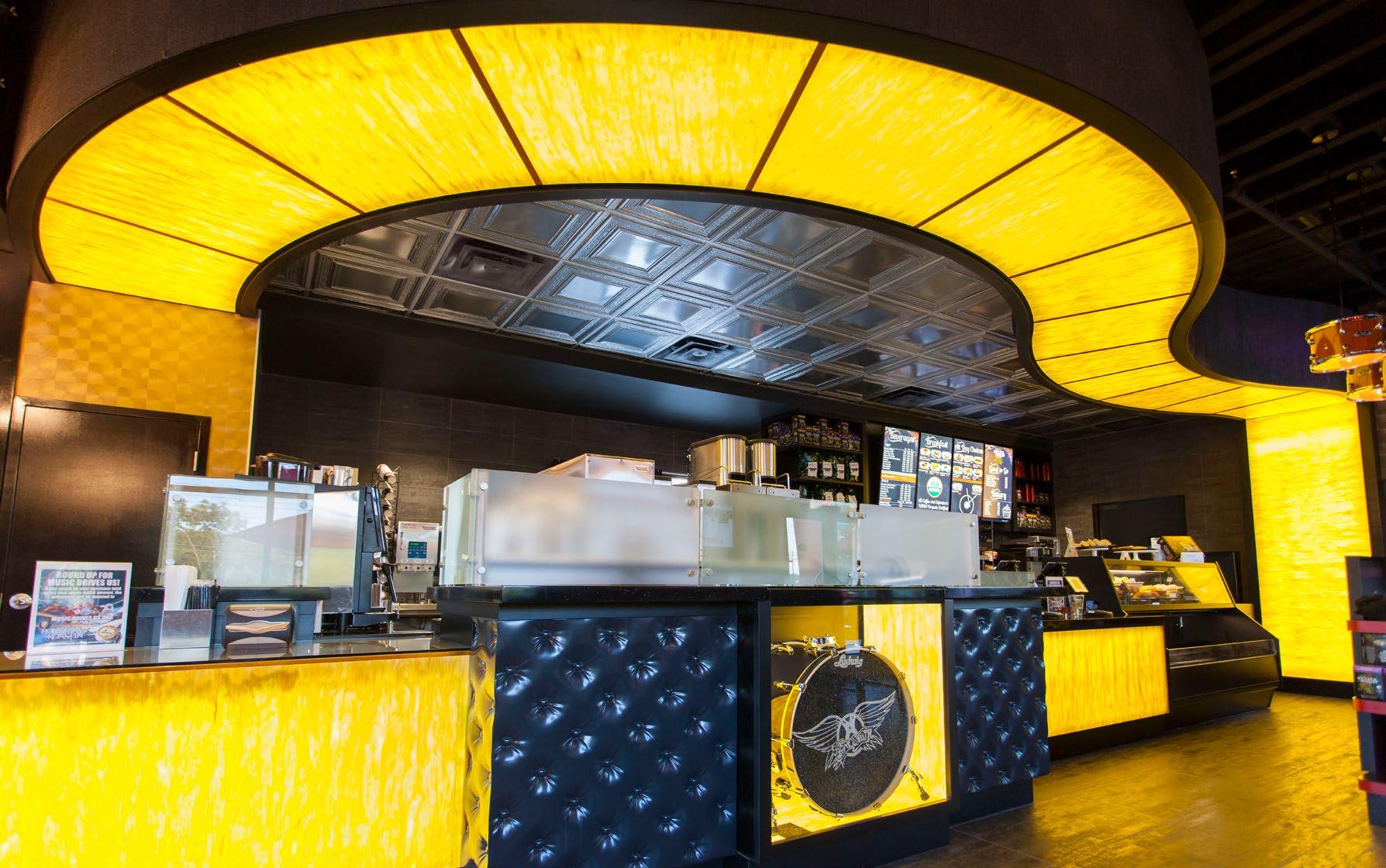 We were responsible for the exterior and interior design, custom millwork, graphics, signage, equipment, and furniture design and selection. To really bring Joey Kramer’s rock n’ roll vision to life, we incorporated music memorabilia from his own collection into the interior, including a full drum kit with display case, stage lighting, and illuminated platform.