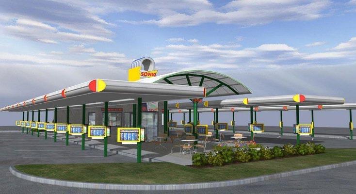 Throughout our work with Sonic, we’ve worked on corporate and franchisee restaurant locations, both new ground-up and retro-fitted locations, and each time our team has been careful to keep designs consistent with the prototype, while still incorporating the needs and creativity that franchisees would like to see in their locations. One such Sonic location melded the prototype with new and interesting developments, like a dog park placed front and center at the restaurant, allowing customers to eat on the patio with their families, four-legged family members included.