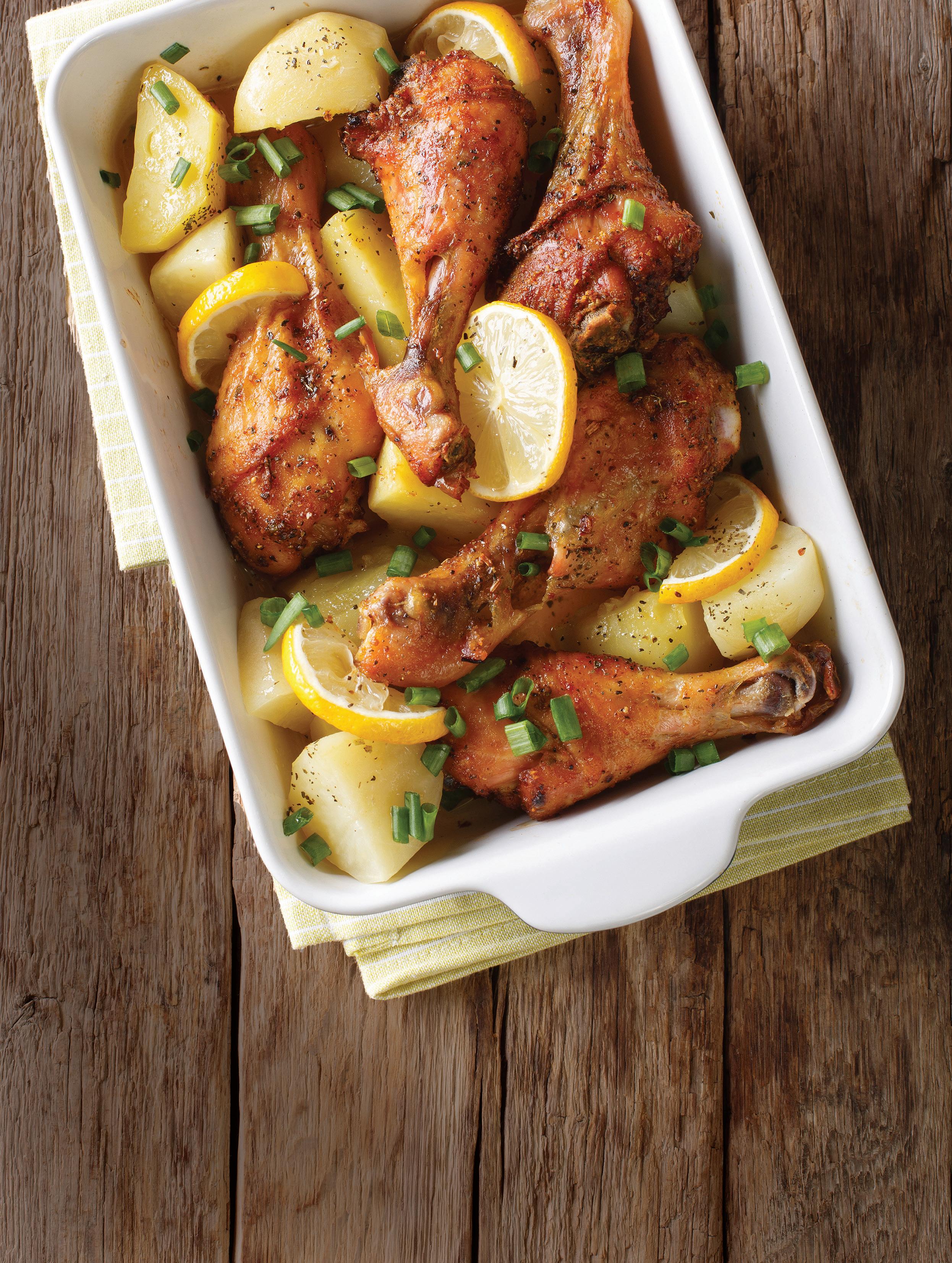 4. Arrange chicken on top, drizzle with remaining lemon oil mixture, and use your fingers or a brush to make sure chicken is well coated. Thinly slice remaining lemon and place slices on top. Roast chicken for 50 to 60 minutes, basting every 15 minutes with pan drippings, until golden brown and an instant-read thermometer inserted into thigh reads 170° to 175° and potatoes are tender. If top of chicken is browning too quickly, cover pan loosely with aluminum foil.