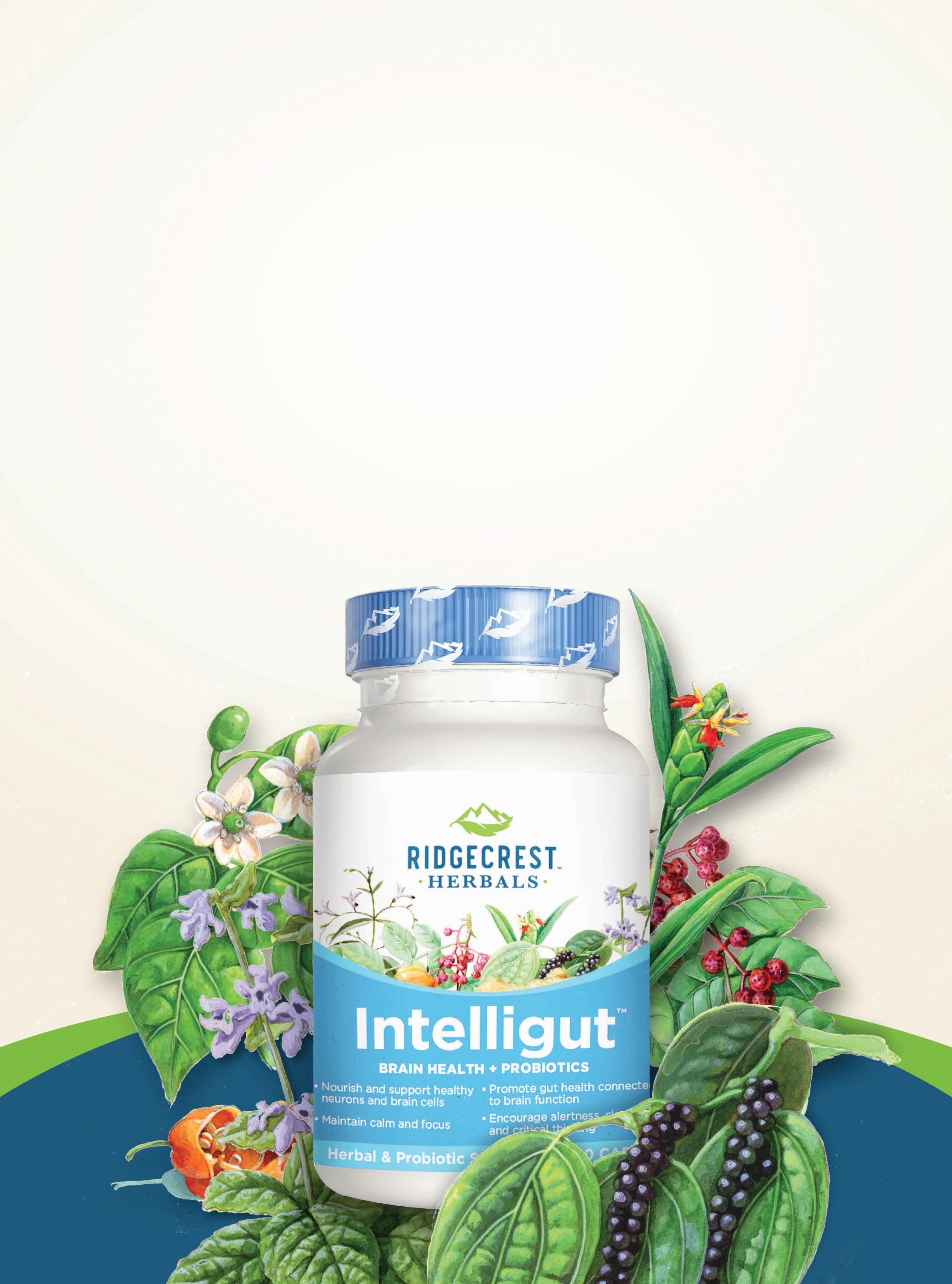 RidgeCrest Herbals is excited to introduce Intelligut™, a unique product that includes probiotics for gut health and nootropic herbs for brain health, providing these closely-related systems with the support needed to work together better.