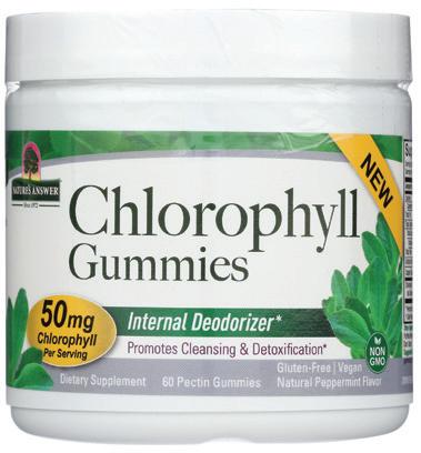 Nature’s Answer adds Gummies to their popular chlorophyll line of products. These refreshing peppermint gummies supply 50 mg chlorophyll per serving.* Chlorophyll promotes cleansing and detoxification, and acts as an internal deodorizer.* These vegan gummies, sourced from clean alfalfa, also support fresh breath.*