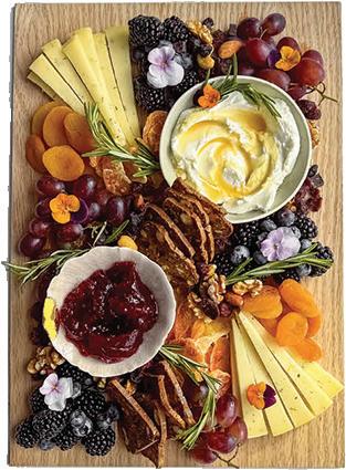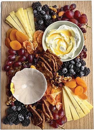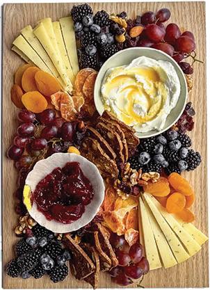 As for the cheese, one large piece on the board can be better than three or four smaller chunks. Smaller pieces can dry out quickly. When shopping for cheese, look for interesting shapes, colors, and flavors. Seek out goat’s and sheep’s milk varieties in addition to cow’s milk cheeses. Garnishes should complement the cheese. Consider bread and butter, fruit (dried and fresh), vegetables (raw, grilled, or pickled), jams, chutneys, nuts (toasted or raw), and chocolate. Place these on the board or alongside it.