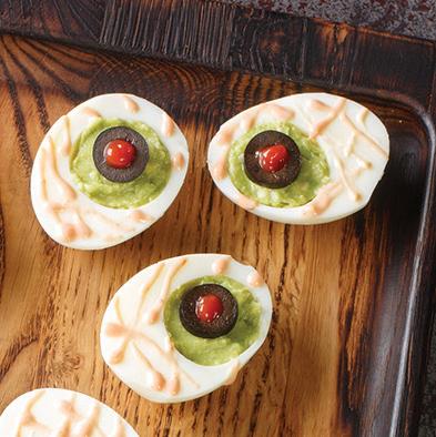 Spooky deviled eggs: Make your favorite recipe for deviled eggs. Place green sliced olives with pimentos in the yolk area to create an eyeball. Add thin slices of red pepper strips around the eye to give it a bloodshot look.