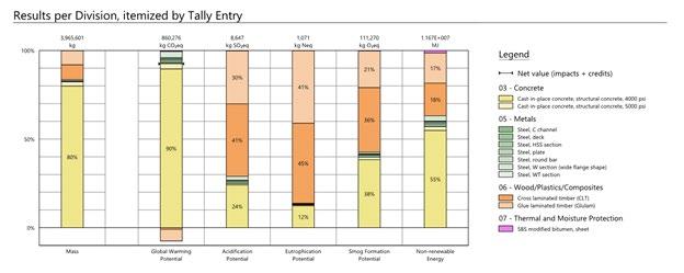 The early design LCA was based on a schematicdesign-level building and industry-average emission data. At the early stages of design, when construction logistics and subcontractors are typically far from settled, this was deemed an appropriate avenue for estimating embodied carbon values. Once construction was underway, the analysis for the full