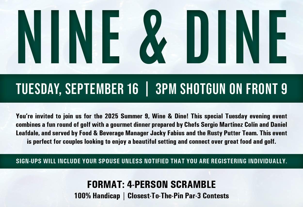 For special events with entertainment, reservations are required by email 24 hours in advance at rustyputter@hampton.golf . This is to help streamline the reservation process and ensure the correct Guest count. For these events, we offer a modified menu to ensure seamless and timely service and Guest satisfaction. Walk-ins are welcome but may experience a wait as reservations will be given priority.