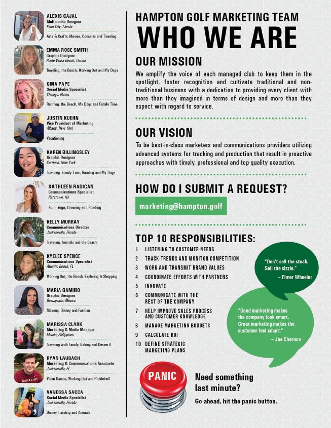 First, the proprietary training solutions, testing, and reporting built solely for Hampton Golf Team Members and Leaders share actionable philosophies for Team Members to grow their careers. Second, the Board will work directly with the Executive Team and company leadership, with whom will have a direct line of communication. Finally, there is no other company in the industry that provides the level of technical and strategic marketing, communications, and sales support systems.