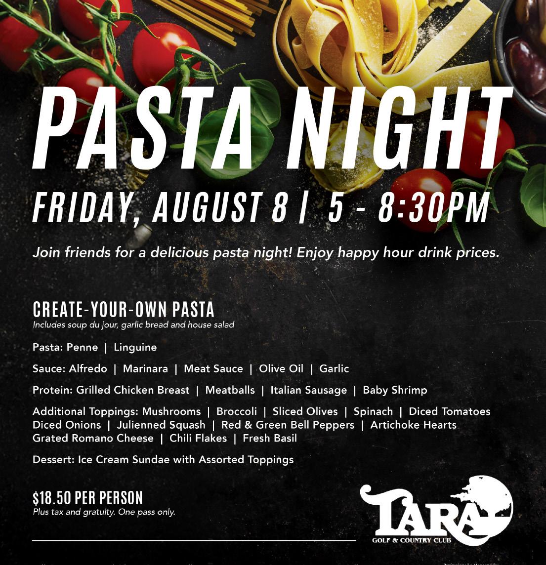 • Friday, August 8 – Pasta Night/Happy Hour, 5-8:30 pm