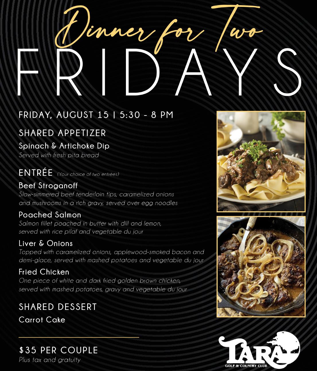 • Friday, August 15 - Dinner for Two/Happy Hour, 5:30-8 pm