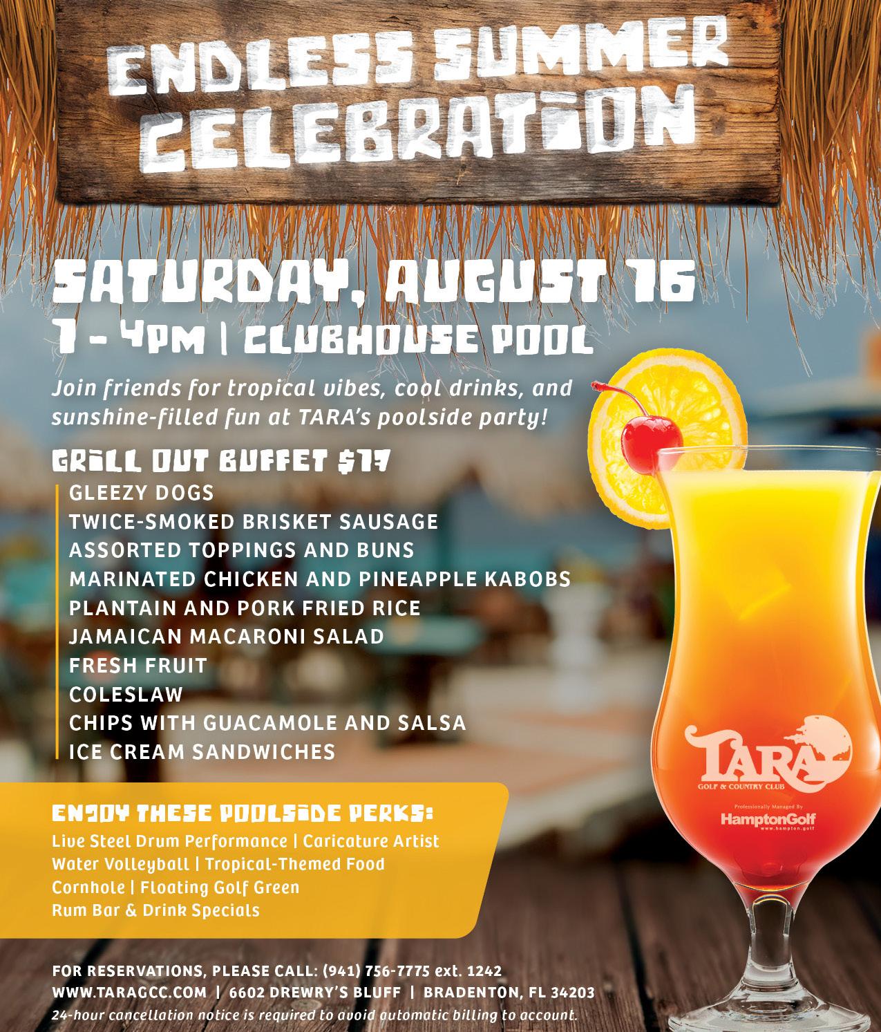We have also had the pleasure of collaborating with two of our newest Tara Club Team Members, Sam and Olivia, who have brought a fresh wave of energy and creativity to our planning. One perfect example is the upcoming Endless Summer Celebration on Friday, August 16 from 1 to 4 PM at the pool.