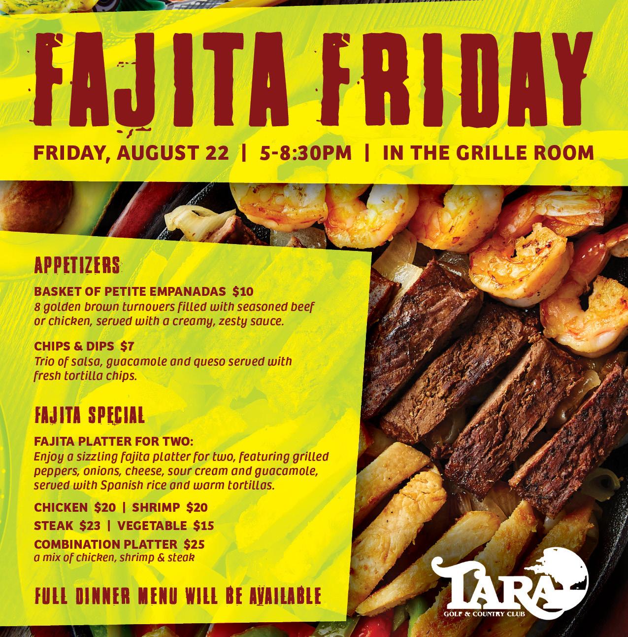 • Friday, August 22 – Fajita Friday/Happy Hour, 5-8:30 pm