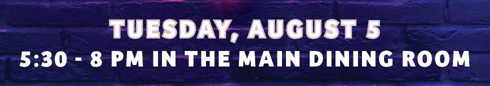 • Tuesday, August 5 – Trivia, Dinner menu 5–8 pm