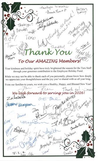 As we approach the holiday season, the entire Team at Tara Golf & Country Club would like to extend our sincere gratitude to all Members for your generous contributions to the Employee Holiday Fund. Your kindness and support make it possible for us to celebrate the season and show appreciation to our hardworking team.