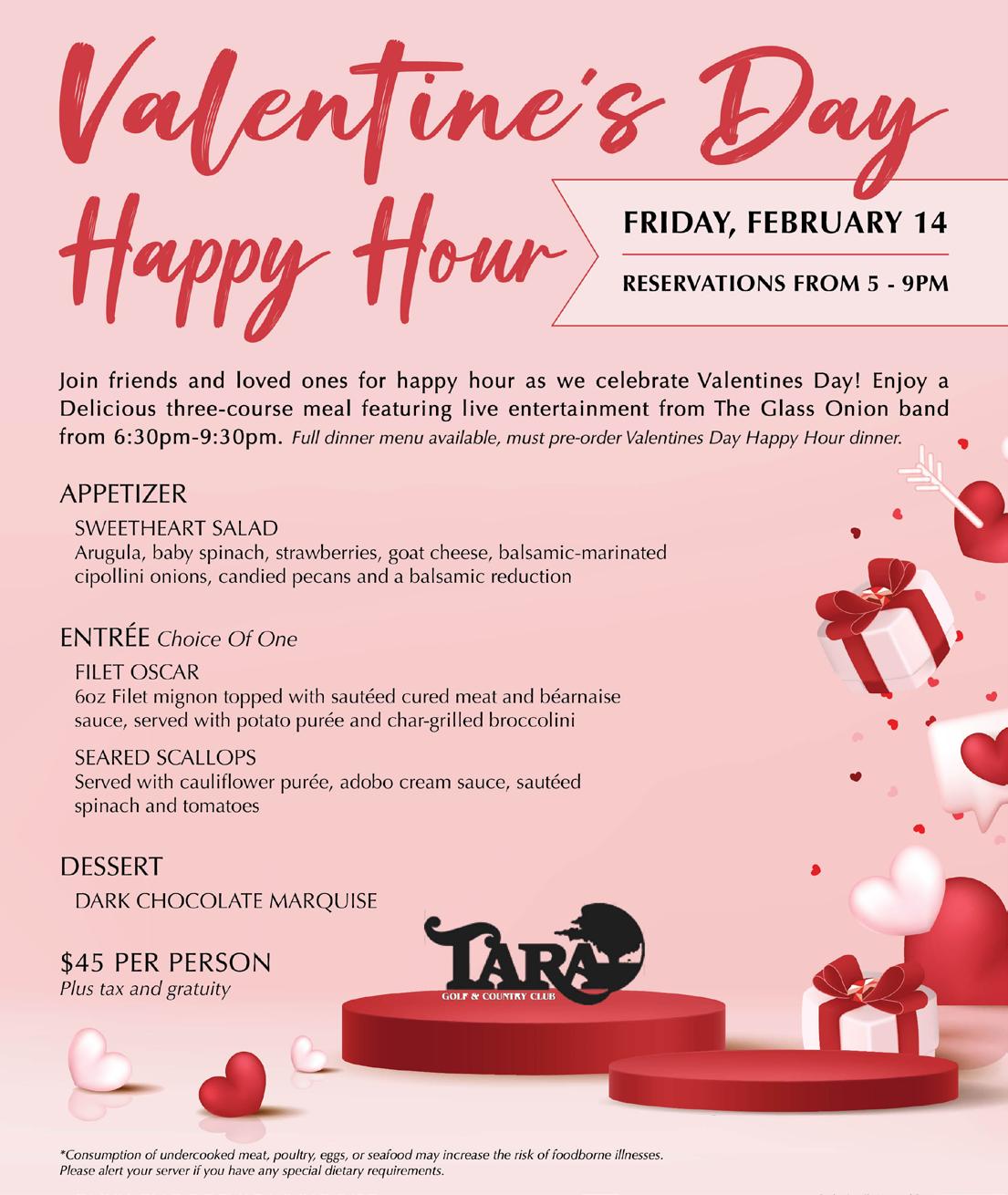 Valentine’s Day Happy Hour on February 14 with a special three course meal and music by The Glass Onion. Regular menu will be available as well.