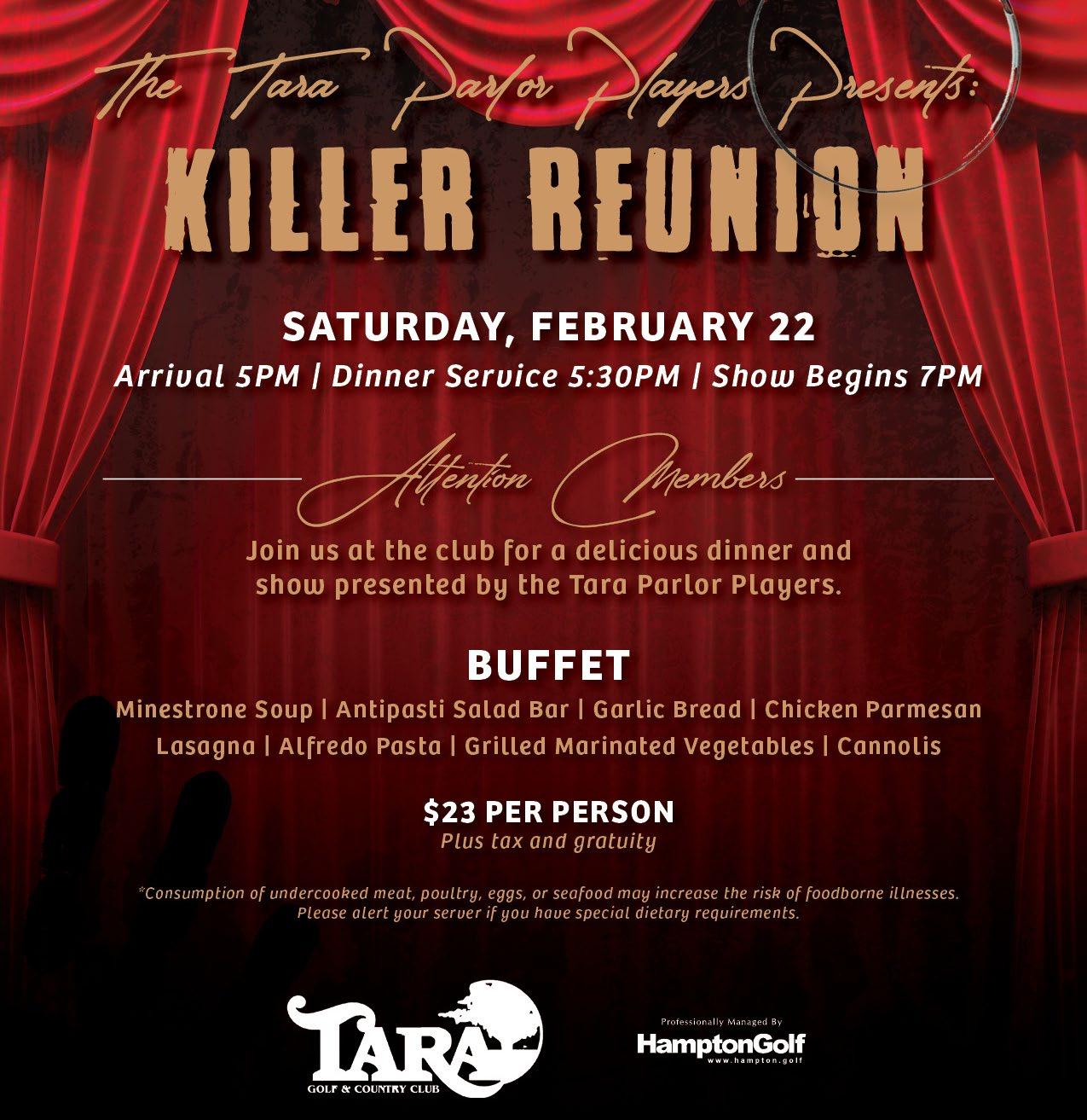 Don’t miss the “Killer Reunion” presented by the Tara Parlor Players on February 22nd. Come support your fellow neighbors as they take the stage!