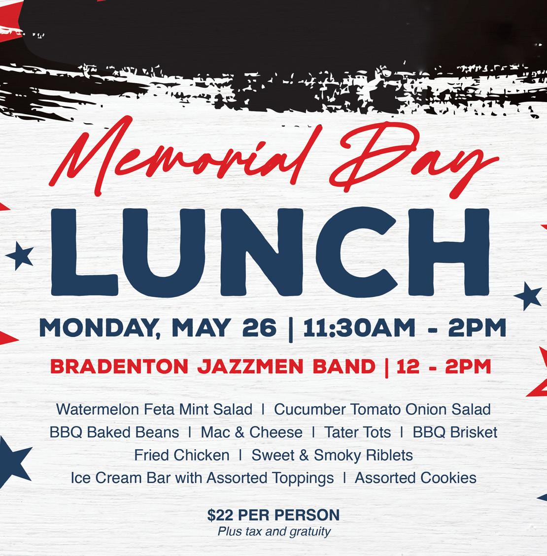 Mark your calendars for Memorial Day on Monday, May 26! After the traditional golf outing, enjoy live entertainment by the Bradenton Jazz Band from noon to 2 PM. It promises to be a wonderful day filled with great music and company.