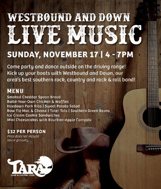 Tara’s Social Committee presents Kick up your heals with Westbound & Down local best southern rock & roll band on Sunday November 17th, 2024. Make sure to come enjoy this amazing outdoor event with neighbors and wear your best hats and boots.
