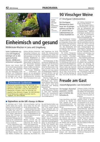 und Umgebung, der Fachschule für Hauswirtschaft Frankenberg in Tisens, der Landwirtschaft und den örtlichen Gastronomiebetrieben. Am Donnerstag, 12. Mai, werden die Wildkräuter-Wochen um 19.30 Uhr feierlich eröffnet. Bei einem GalaAbend im Restaurant »vigilius mountain resort« am Vigiljoch wird den Gästen ein fünfgängiges Wildkräutermenü serviert, das auf die gastronomischen Wochen einstimmen soll. Weiteres finden am 18. und 25. Mai WildkräuterFührungen statt. Interessierte können dabei heimische Kräuter sowie deren Bedeutung und Wirkung kennenlernen. Weitere Informationen zu den Wildkräuter-Wochen in Lana und Umgebung finden alle Interessierten im Internet auf der Seite www.wildkraeuter.it.