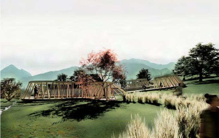 This project is inspired by the f lowing shape of the river. It experiment withtimber’s shape to interact with human’s spaces and the location of the pools in between. Flowing Height is a place welcoming people who are recovering from diseases, travelers of the trails around, to any people who would like to be cured by the nature in the beautiful Blue Ridge Mountians.