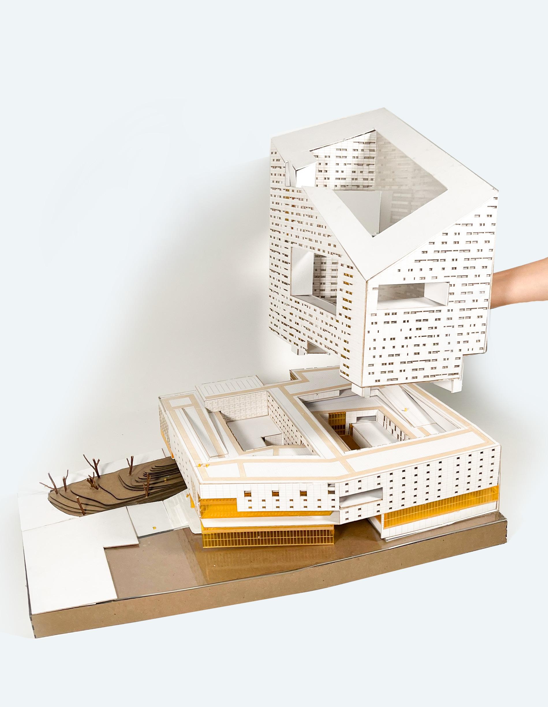 Modular and fractal ideas are being used to enable the building to build def iciently. Modular spaces are also created to be used either as offices, labs, or recreational public spaces.