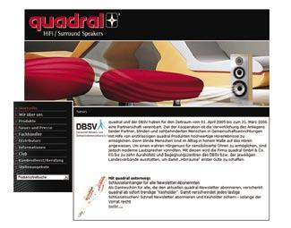 Duh italijanskog dizajna u nemačkoj izvedbi... Zaista neobična kombinacija, koju svakako treba detaljnije istražiti, makar putem interneta. Vizuelni identitet stranice je veoma jasan, sa odlično definisanimcelinamaidobroiskorišćenimprostorom.Možesezameritilošeorganizovanoj dvojezičnosti sadržaja (engleski/nemački), koja često ne funkcioniše kako treba, što dovodi do spoticanja kroz tehničke podatke izlistane na nemačkom. Navigacija kroz izuzetno bogatu paletu proizvoda je odlično rešena i znatno olakšava snalaženje. Quadral trenutno u ponudi ima petnaest serija proizvoda, od klasičnih Hi-Fi zvučnika i surround kitova pa do kutija namenjenih spoljašnjoj ugradnji, a tu je i brojna dodatna oprema. Svaki model je predstavljen slikom i tehničkim karakteristikama, kao i dodatnim propratnim tekstom i listom testova objavljenih u medijima. Vrlo korektan detalj je i istaknuta cena za sve proizvode, što retko srećemo na stranicama ovog tipa.
