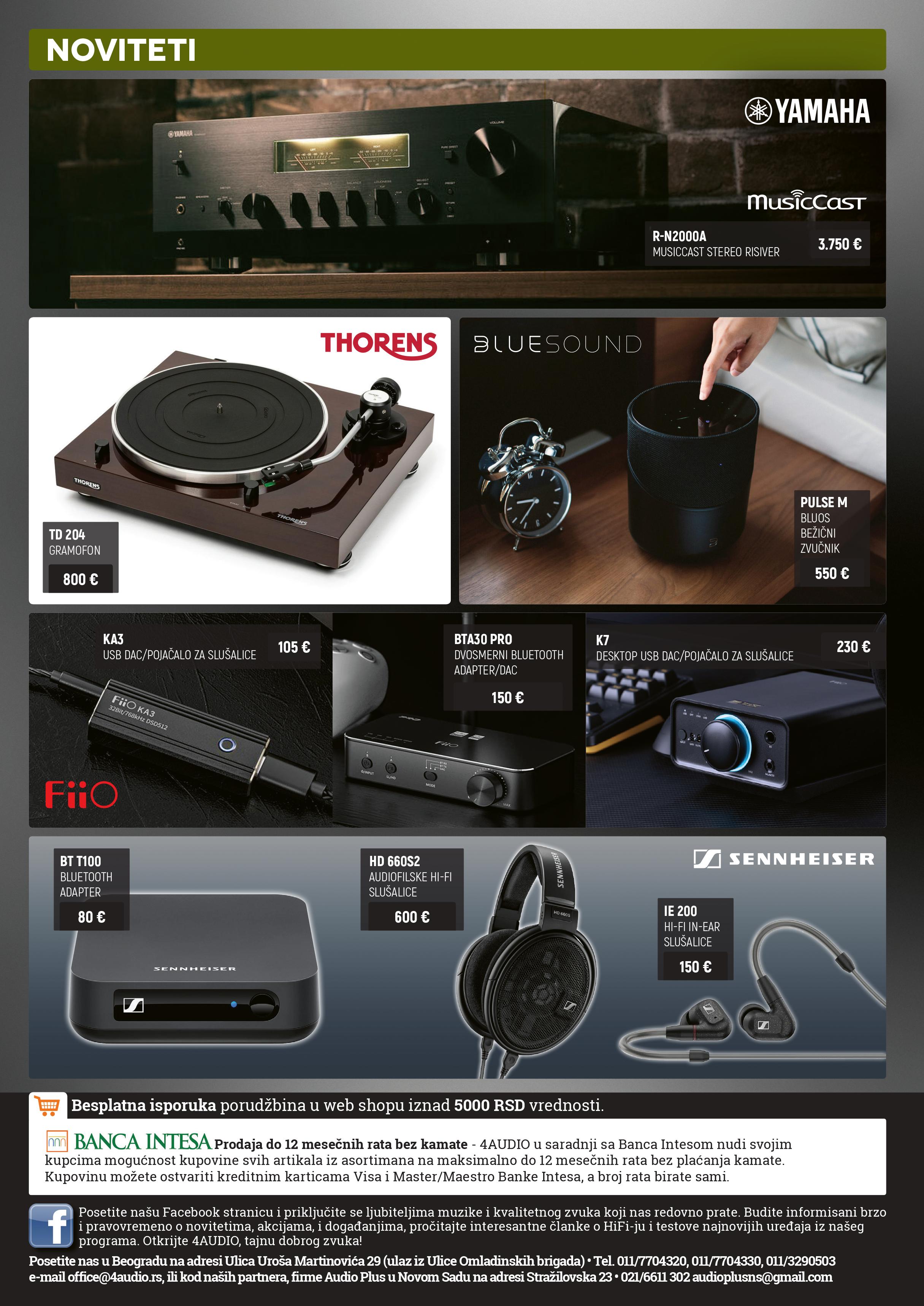 Kad je hi-fi tehnika u pitanju, pripremili smo nekoliko poslastica – od Metronome CD transporta pod imenom Le Player 4 do željno iščekivanog Yamaha stereo-risivera R-N2000A. Od pristupačnijih uređaja tu su DAC kompanije FiiO sa oznakom K7, zatim slušalice kompanije JBL iz serije Tour, kao i njihov saundbar JBL Bar 300 Pro. Jedna od zvezda ovog broja svakako su i aktivni zvučnici kompanije DALI – njihov model OBERON 1 C dolazi u formi kompaktnih regalskih zvučnika i čini se idealnim za prostorije manje i srednje veličine. Ako ste u potrazi za audiofilskim slušalicama, Sennheiser je pripremio novu verziju modela, koji sada nosi naziv HD 660S2. U pitanju su slušalice otvorenog tipa koje pružaju zaista impresivno preciznu reprodukciju i nenadmašnu transparentnost.