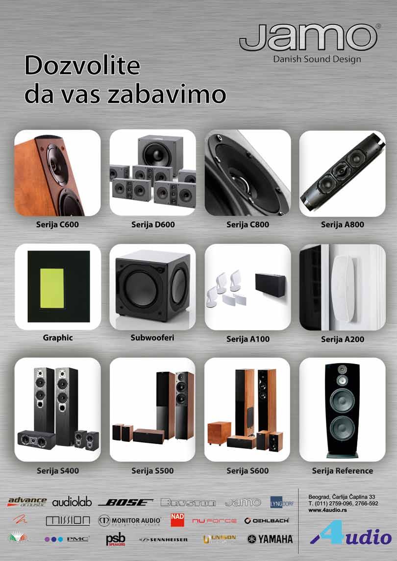 Proizvođač Model Cena Tip Opis napajanja Izobličenja (THD %) Tačnost RIAA krive (dB) Odnos signal/šum (dB) Audio Research PH 6 2900 mm/mc Interno REF Phono 2 10300 mm/mc Interno 0,002 +/- 0,2 Audiolab 8000PPA 755 mm/mc/mcx30 Interno 0,003 mm / 0,006 mc 75 Cambridge Audio Azur 540P 80 mm Eksterno < 0,009 +/- 0,65 85 Azur 640P 150 mm/mc Eksterno < 0,007 +/- 0,3 86/72 (mm/mc) Clearaudio Smart Phono 400 mm/mc Eksterno 0,004 +/- 0,3 84/68 (mm/mc) Symphono + 1200 mm/mc Eksterno 0,004 +/- 0,1 65 (mc) Creek OBH 18 220 mm < 0,03 +/- 0,5 83 OBH 15 290 mm/mc < 0,03 +/- 0,5 83/75 (mm/mc) Electrocompaniet ECP 1 1200 mm/mc Interno 0,007 +/- 0,1 88/88 (mm/mc) Linn Uphorik 2120 mm/mc Interno 0,015 +/- 0,2 105 NAD PP-2i 95 mm/mc Eksterno +/- 0,3 80/78 (mm/mc) PP-3i 150 mm/mc Eksterno +/- 0,3 78/76 (mm/mc) Naim Audio Stageline 350 mm/mc Bez napajanja SuperLine 2280 mc Bez napajanja <0.005 +/- 0.1 82 Pro-Ject Phono Box 65 mm Eksterno Phono Box II/USB 100/130 mm/mc Eksterno 0,01 mm / 0,05 mc +/- 0,5 86/68 (mm/mc) Phono Box SE II 220 mm/mc Eksterno 0,03 mm / 0,1 mc +/- 0,3 95/75 (mm/mc) Tube Box SE II 500 mm/mc Interno cevno 0,03 mm / 0,1 mc +/- 0,3 95/75 (mm/mc) Rega Fono Mini A2D 110 mm Eksterno 78 Simaudio MOON 110 LP RS 630 mm/mc Eksterno <0,001 +/- 0,5 87 MOON 310 LP RS 1700 mm/mc Interno <0,001 +/- 0,5 88 MOON 810LP 9980 mm/mc Eksterno <0,0008 +/- 0,1 95 Trafomatic Phono One 870/1150 mm ili mc Interno 0,3 88 VTL TP-2.5 Mk II 2600 mm/mc Interno 45/60 (mm/mc) TP-6.5 8900 mc/opciono mm Interno 68 Kompleti zvučnika Proizvođač Model Cena Tip Sastoji se od modela Broj drajvera po kanalu (prednji/centralni/zadnji) Snaga po kanalu (prednji/centralni/ zadnji) Prečnik basa subwoofera (mm) Snaga pojačala subwoofera (W) Bose AM6-III 990 5.1 1/1/1 130 AM10-IV 1420 5.1 2/2/2 2x130 AM15-III 1840 5.1 2/2/2 Canton Movie 70 335 5.1 2/3/2 100/100/100 165 100 Movie 160 670 5.1 2/3/2 120/120/120 200 120 Movie 1005 515 5.1 2/3/2 100/100/100 200 120 Movie 1050 910 5.1 5/3/2 120/100/100 200 120 Movie 2050 1940 5.1 5/3/2 150/130/120 220 200 Movie 3050 2600 5.1 5/3/2 170/170/120 220 200 Epos AVS 5.1 1150 5.1 2/3/2 100/100/100 200 100 Harman/ Kardon HKTS 16 530 5.1 3/3/3 120/120/120 200 200 HKTS 30 600 5.1 3/3/3 120/120/120 200 200 HKTS 60 825 5.1 3/3/3 120/120/120 200 200 Jamo A 101 HCS 5 320 5.1 1/1/1 50/50/50 203 200 A 102 HCS 6 425 5.1 2/3/1 60/60/60 230 200 A 200 HCS 5 625 5.1 3/3/3 80/80/80 230 200 JBL Cinema 300 340 5.1 2/3/2 100/100/100 200 150 Cinema 500 385 5.1 3/3/3 100/100/100 200 150 KEF KHT2005.3 865 5.1 2/2/2 100/100/100 250 250 PSB Alpha HT-1 700 5.1 LR1, CLR1, SubSeries 1 2/3/2 80/80/80 203 110 Image HT-2 900 5.1 B4, C4, SubSeries 125 2/3/2 80/80/80 203 125