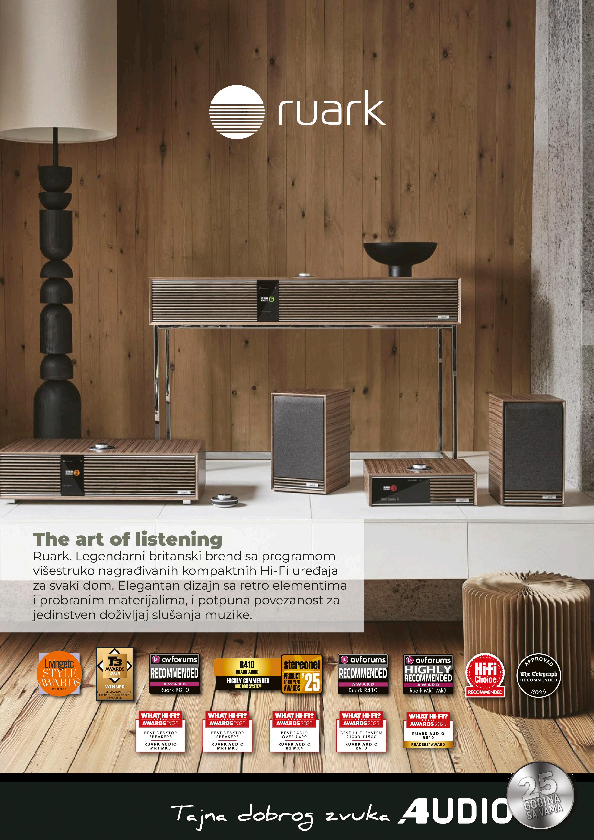 hoda, a za pokretanje je predviđeno pojačalo od 750 vati u klasi D. Nova surround elektronika takođe sadrži šest modela - AV risivere AVA15, AVA25 i AVA35, 16-kanalni procesor AVP45 i izlazna pojačala PA4 i PA9. Dizajn je moderan i prepoznatljiv, a ispod poklopca se nalazi amplifikacija u klasi D, dok skuplji modeli koriste patentiranu tehnologiju, koju Arcam naziva "klasa G". Svi modeli podržavaju imerzivne formate i Dirac Live korekciju zvuka, dok mrežno povezivanje prihvata sve popularne servise. Snaga risivera kreće se od 75 do 100 vati po kanalu na osam oma (kad je pokrenuto svih devet kanala), a za kontrolu su predviđeni blutut daljinac i aplikacija. Cene zvučnika kreću se od 2.000 do 7.000 evra za par, dok je za elektroniku potrebno izdvojiti od 1.000 do 7.000 evra. i www.arcam.co.uk M 1.000-7.000 €