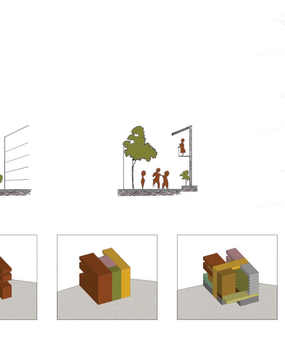 subtraction in relation and climate provision of a green verticle space for community alongside the core mutually placing all elements with relation to one another.