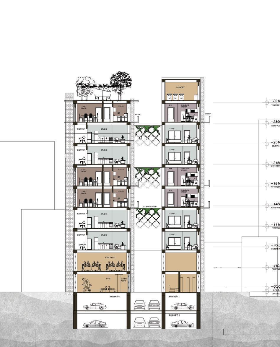 the units are designed such a way that each floor has a connection to the neighbours through verticle gardens and studios.