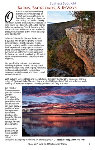 LaDonna’s beautiful “Barnes, Backroads & Byways” fine art photography features outdoor scenes that boost your mood, inspire creativity, and increase motivation. Each experience brings opportunities to share an appreciation for the beauty that surrounds us. LaDonna’s leasing program for businesses transforms boring offices into restorative environments that inspire and motivate. Her love for the outdoors and vintage buildings captures timeless beauty that is rapidly disappearing or changing. Resulting in stunning photographs featured on notecards, metal, canvas, and prints … and several close calls. With autumn leaves ablaze, she rose at dawn--temps in the low 20’s--to capture the fog rising off Tablerock Lake. The next day, she hiked Whitaker Point Trail in the dark—nearly walking off a narrow ledge--to photograph Hawksbill Crag at sunup. But with her leasing program, you can surround yourself with beauty throughout the year without the close calls! You can even apply a portion of your lease payments toward the purchase of a beautiful “Barnes, Backroads & Byways” fine art photography. Interested in purchasing or leasing art for your home or office? Check out a sampling of her fine art photography at 21ReasonsToSayThankYou.com. Please say “I found it in 417metrowoman” Thanks!