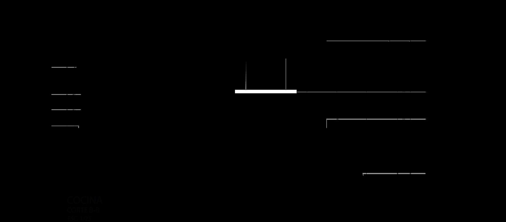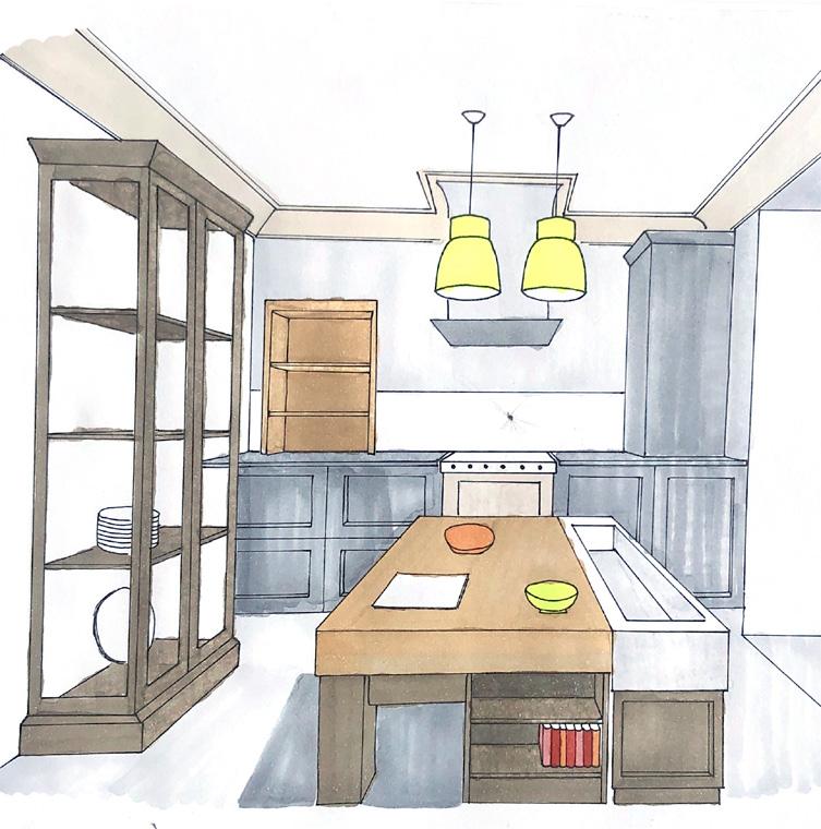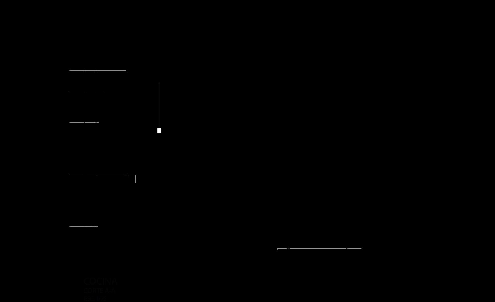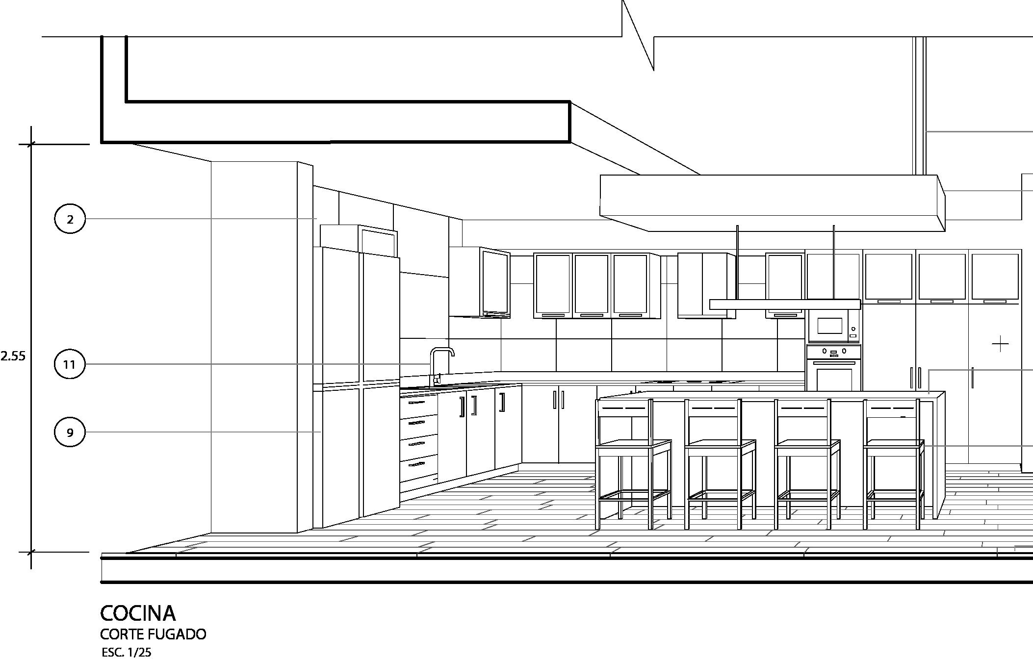 Proyecto de cocina abierta en un loft. Muebles y materiales a elección. Se presentaron dos cortes, planta, corte fugado y collage con escala humana y detalle de sombras.