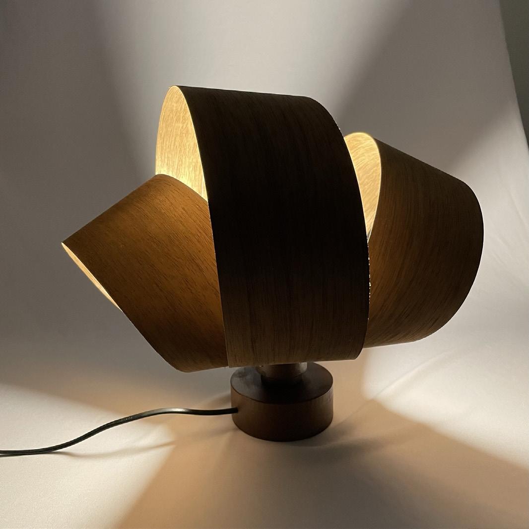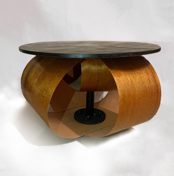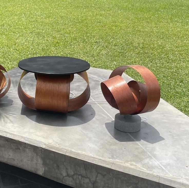 Se utilizó de inspiración la lámpara “Verso Table Lamp” del diseñador Tom Raffield para poder generar una línea de mobiliarios. Al inicio se estudió al diseñador y sus técnicas. Tras conocer su proceso de trabajo se buscó imitar su lampara con enchape de madera y una base metálica.