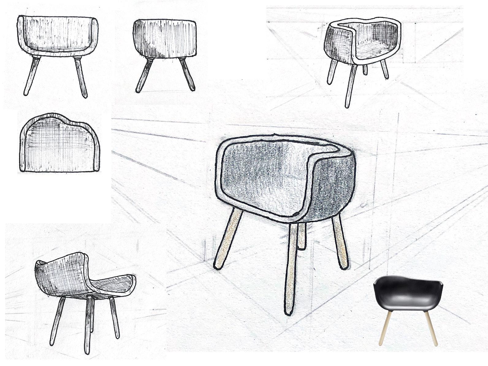 Sillas de diseño dibujadas en tres perspectivas distintas escogiendo una de ellas como imagen central y añadiendole detalles de color. Se incluyeron sombras y las distintas vistas ortogonales: planta, frontal y lateral.