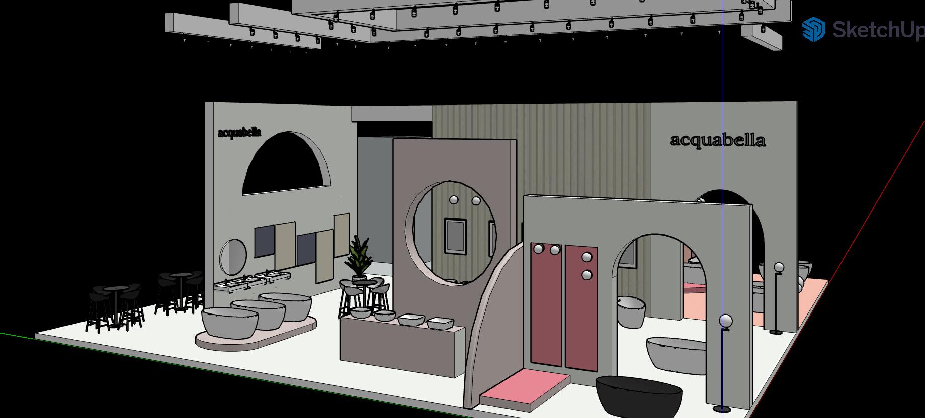 En ambos proyectos se buscó replicar los stands en base a imagenes referenciales. El stand de aquabella fue únicamente en SketchUp para generar volumenes y dimensiones, los mobiliarios sacados de internet.