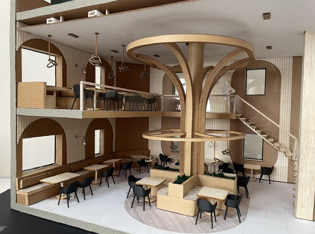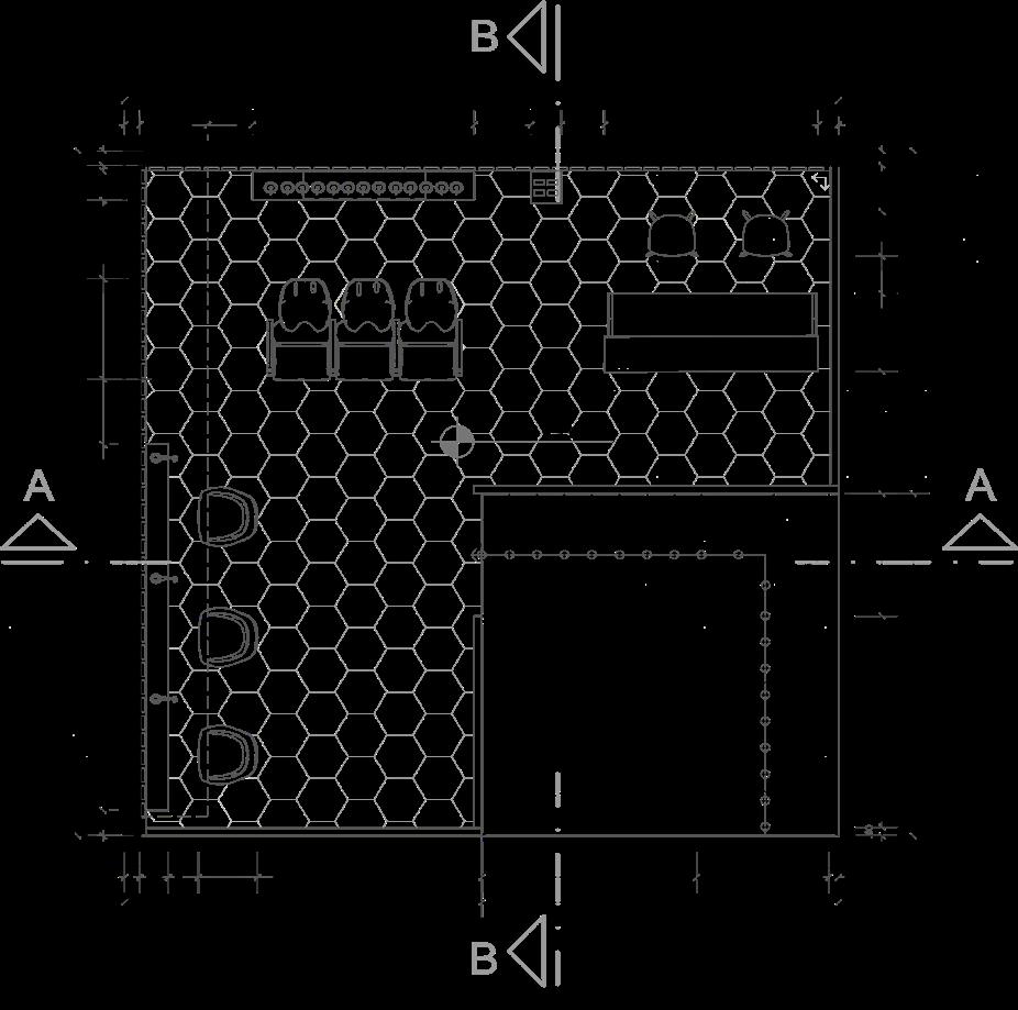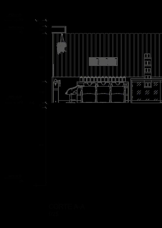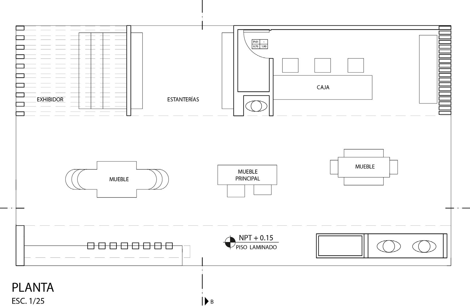 Se realizaron plantas y cortes detallados de ambos niveles. La propuesta incluye una mejor distribución e iluminación para mejorar el servicio que recibirían los usuarios. También se implementó una propuesta de aislamiento térmico con un doble muro de viguetas de madera y plantas colgantes para evitar que el sol interrumpa las actividades en el interior sin cambiar la fachada de mamparas de vidrio.
