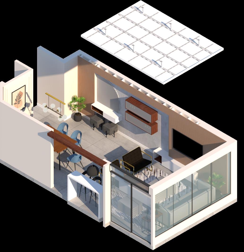 Se realizó una sala comedor en base a una imagen referencial y únicamente el perímetro del área para los planos. En base a medidas reglamentarias e imagenes referenciales se hicieron la planta y el corte en Autocad. Después se hizo el levantamiento en Sketchup