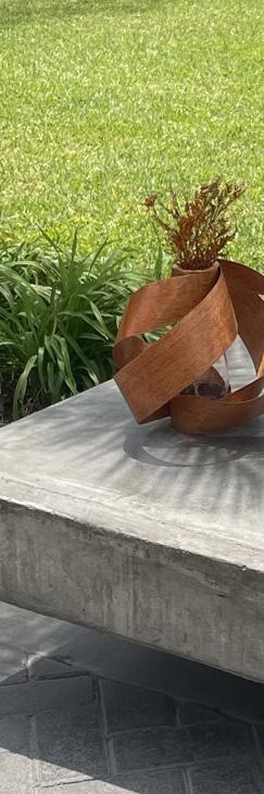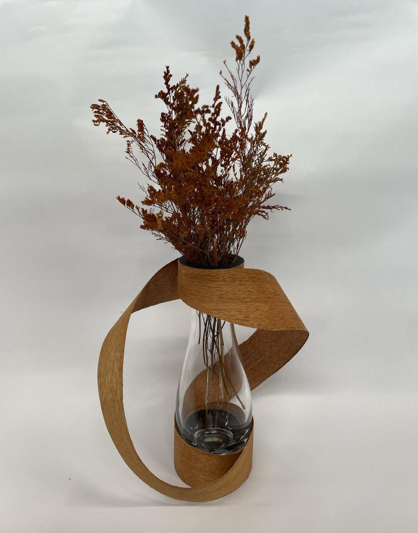 Tras conocer lo que caracterizaba al diseñador, se realizó una variación de la lampara original. Se generaron más vueltas al enchape para darle otra visión, la base se imprimió en 3D y se le dió un acabado de granito. Para completar la colección se mandó a hacer una mesa metálica y un florero al cual se le agregaron bases de madera. Ambos fueron intervenidos con enchape para mantener el lenguaje de Raffield.