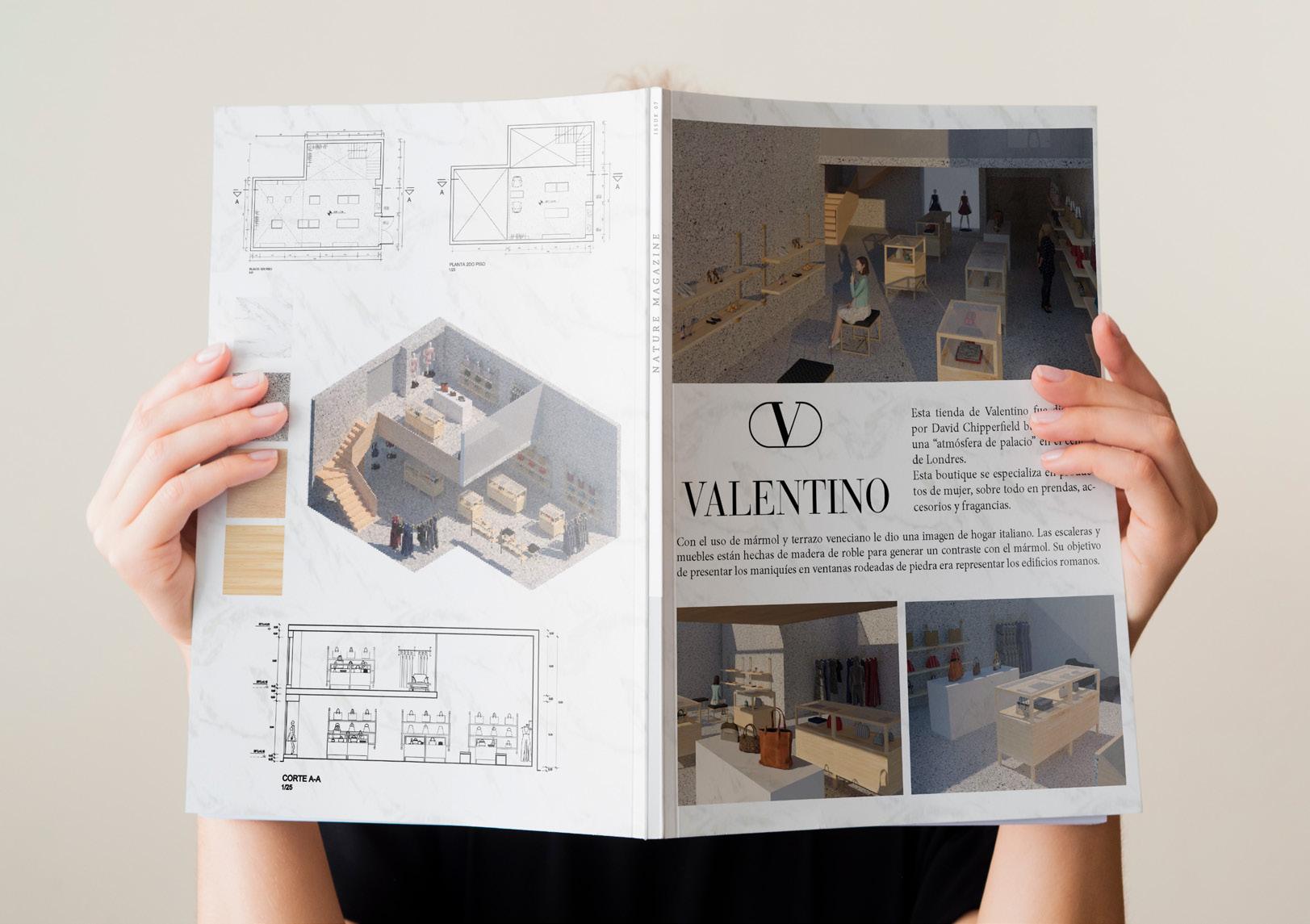 Se buscó replicar la tienda Valentino ubicada en un área máxima una mezzanine. Después planos y perspectivas, mockup “promocionando”