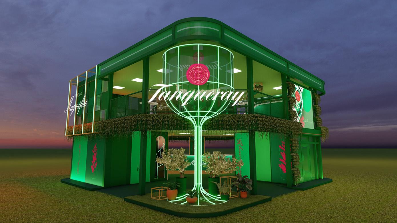 En el stand de Tanqueray se utilizó SketchUp y Vray para renderizar. Los mobiliarios y estructura fueron realizados desde cero y se empleron imagenes para imitar los patrones y publicidades.