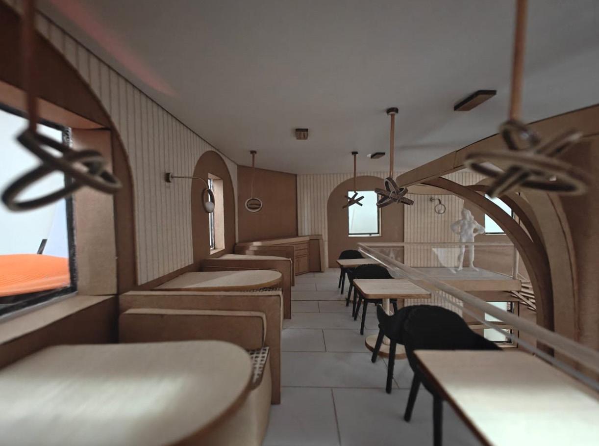 Se generó una composición con inteligencia artificial y se buscó imitarla en cuanto a mobiliario, colores, texturas y dimensiones. Todo fue modelado desde cero en Rhino excepto la vegetación.