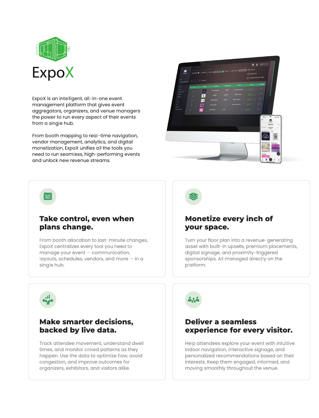ExpoX is an intelligent, all-in-one event management platform that gives event aggregators, organizers, and venue manager the power to run every aspect of their events from a single hub. From booth mapping to real-time navigation, vendor management, and digital monetization, ExpoX unifies all the tools you need to run seamles, high-performing events and unlock new revenue streams.