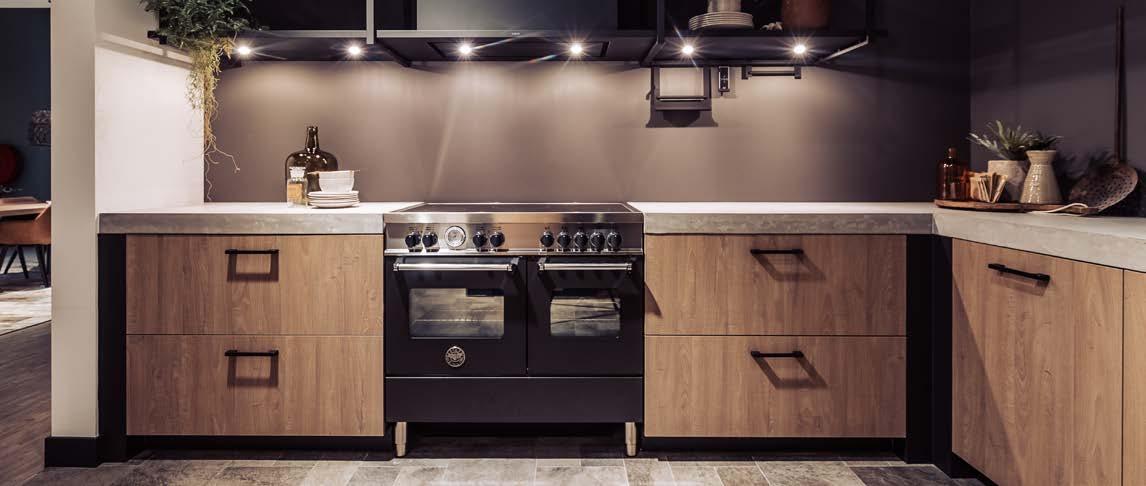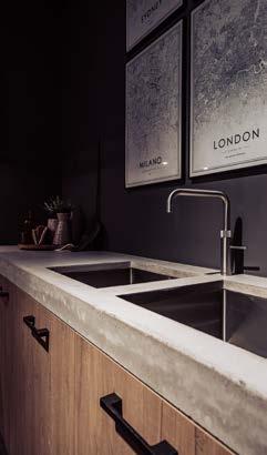 Donkere kleuren geven uw keuken een warm, chique karakter. Een betonnen werkblad in een lichte grijstint is dan een fijne, stijlvolle tegenhanger. Zo’n werkblad mag best een beetje body hebben. De rvs-spoelbak is naadloos in het werkblad geïntegreerd.