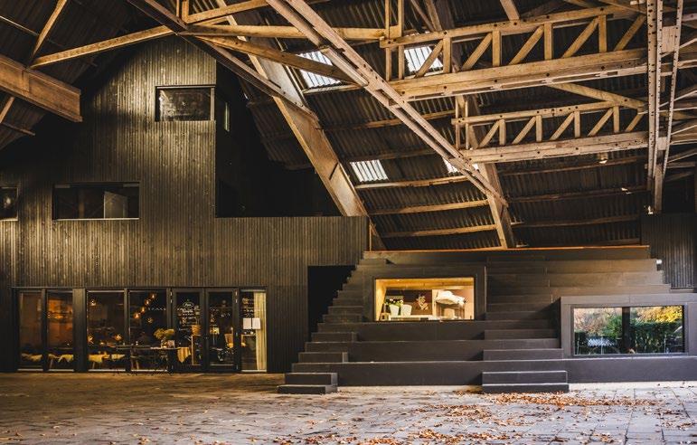 winkels. “Op oude foto’s zie je de kenmerkende toren met horizontale betonbanden, waarin vroeger de veevoeder werd gemengd. Het was technisch helaas niet haalbaar om de toren te behouden, maar we hebben de betonbanden teruggebracht in het ontwerp. Het glazen trappenhuis aan de zijkant geeft met de schuine trappen het oude, industriële karakter weer. En ook in de materiaalkeuze hebben we rekening gehouden met de authentieke kenmerken van de fabriek. Oudere dorpelingen die de fabriek nog in bedrijf hebben meegemaakt, vonden het schitterend.”