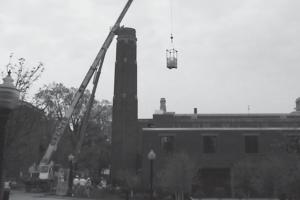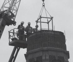 The crane lifts the basket, and then lowers it (with personnel inside) into the smoke stack.