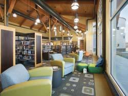 The facility’s design is reminiscent of a traditional bank barn and farmstead, complete with a siloshaped children’s library. The exterior features stone, fibercement siding, and metal roofing. Gable-end windows are narrow and elongated, resembling the vertical ventilation slits of tobacco barns. The marrying of old with new continues inside, where uniquely designed exposed timbers blend with modern steel connectors, stamped concrete flooring, and dramatic colors. The building also includes environmentally-friendly materials and an underground geothermal system.