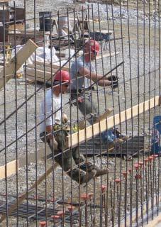 Kurt Yoder and Matt Doerr install reinforcing steel in preparation to a concrete wall pour.