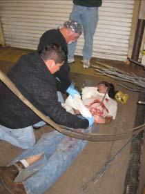 This is only a drill! Members of the First Aid Team respond to a mock injury during the annual triage.